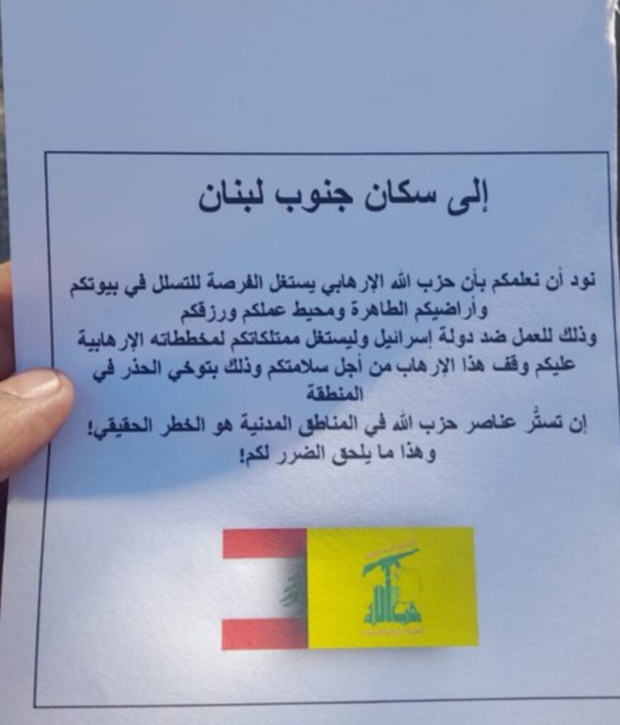 أكد شهود عيان في كفرشوبا وكفرحمام لـ”الأخبار”، أن مسيّرة إسرائيلية ألقت مناشير، صباح اليوم، تحذرهم من أن حزب الله “يتسلل إلى بيوتكم وأراضيكم الطاهرة ومحيط عملكم ورزقكم للعمل ضد دولة إسرائيل”.