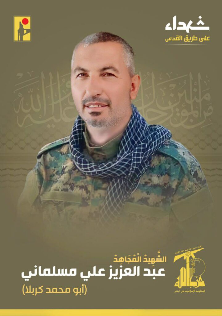 بمزيد من الفخر والإعتزاز، تزف المقاومة الإسلامية الشهيد المجاهد عبد العزيز علي مسلماني  “أبو محمد كربلا” من بلدة الشعيتية في جنوب لبنان، والذي ارتقى شهيداً على طريق القدس.