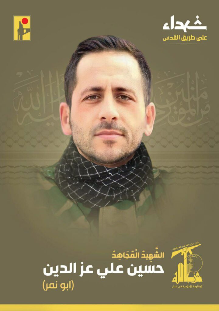 بمزيد من الفخر والإعتزاز، تزف المقاومة الإسلامية الشهيد المجاهد حسين علي عزالدين  “أبو نمر” من بلدة معروب في جنوب لبنان، والذي ارتقى شهيداً على طريق القدس.