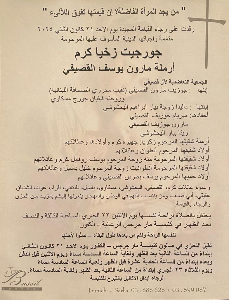 غيب الموت جورجيت زخيا كرم، والدة نقيب محرري الصحافة اللبنانية جوزف القصيفي.