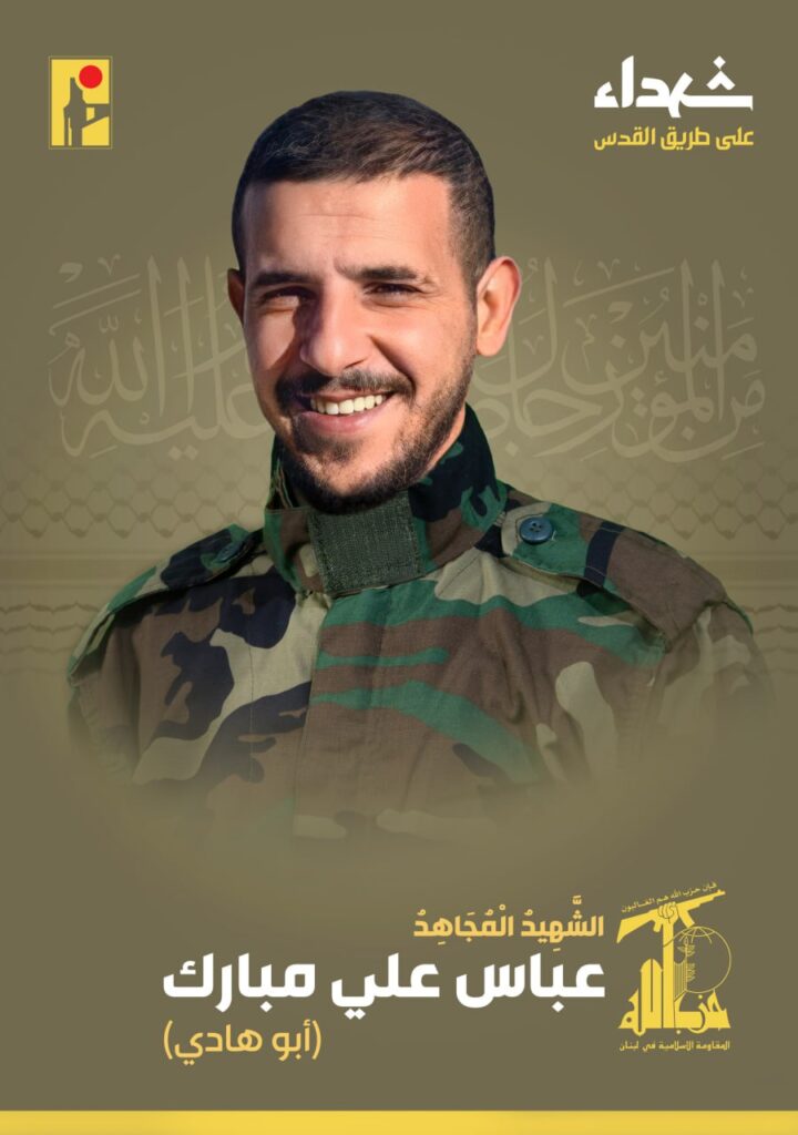 بمزيد من الفخر والإعتزاز، تزف المقاومة الإسلامية الشهيد المجاهد عباس علي مبارك “أبو هادي” مواليد عام 1990 من بلدة الطيبة في جنوب لبنان، والذي ارتقى شهيداً على طريق القدس.