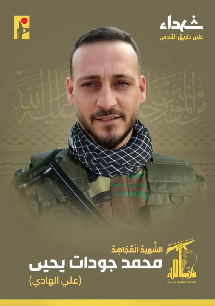 بمزيد من الفخر والإعتزاز، تزف المقاومة الإسلامية الشهيد المجاهد محمد جودات يحيى “علي الهادي” مواليد عام 1995 من بلدة الطيبة في جنوب لبنان، والذي ارتقى شهيداً على طريق القدس.
