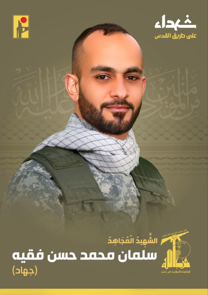 بمزيد من الفخر والإعتزاز، تزف المقاومة الإسلامية الشهيد سلمان محمد حسن فقيه “جهاد” مواليد عام 1994 من بلدة عيترون في جنوب لبنان، والشهيد عباس أحمد الخرسا “حسام” مواليد عام 1987 من بلدة الطيري في جنوب لبنان، واللذين ارتقيا شهيدين على طريق القدس.