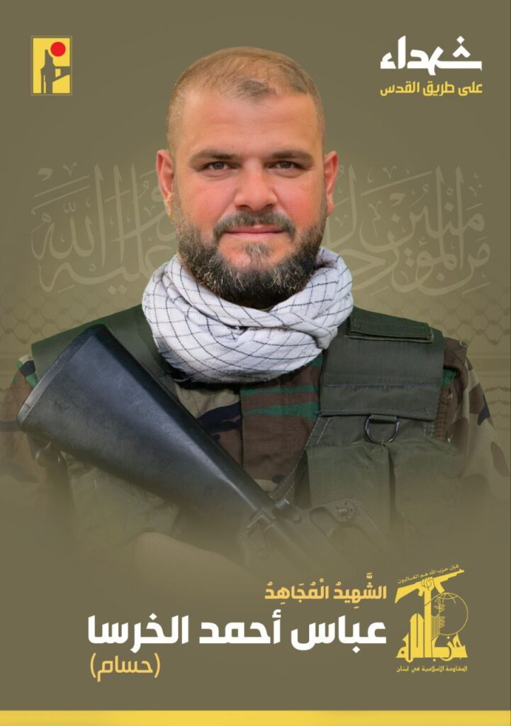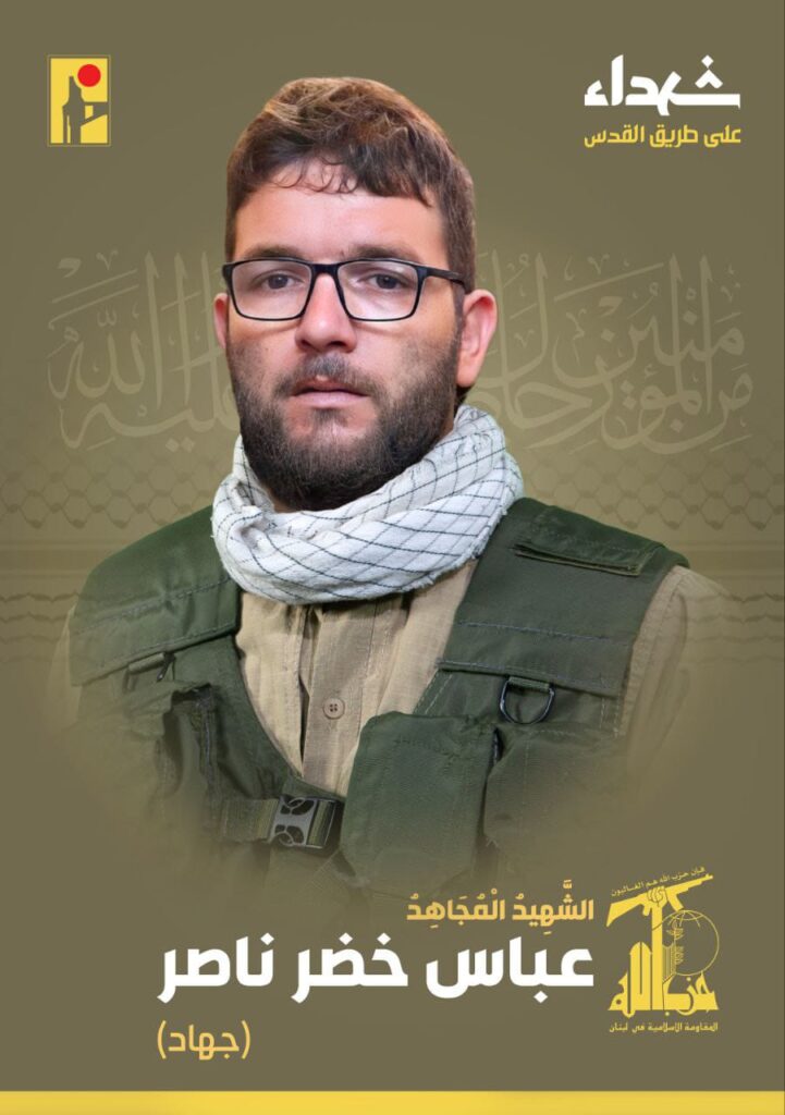 ولاحقا زفت المقاومة بمزيد من الفخر والإعتزاز، الشهيد عباس خضر ناصر “جهاد” مواليد عام 1985 من بلدة يارون في جنوب لبنان، والذي ارتقى شهيداً على طريق القدس.