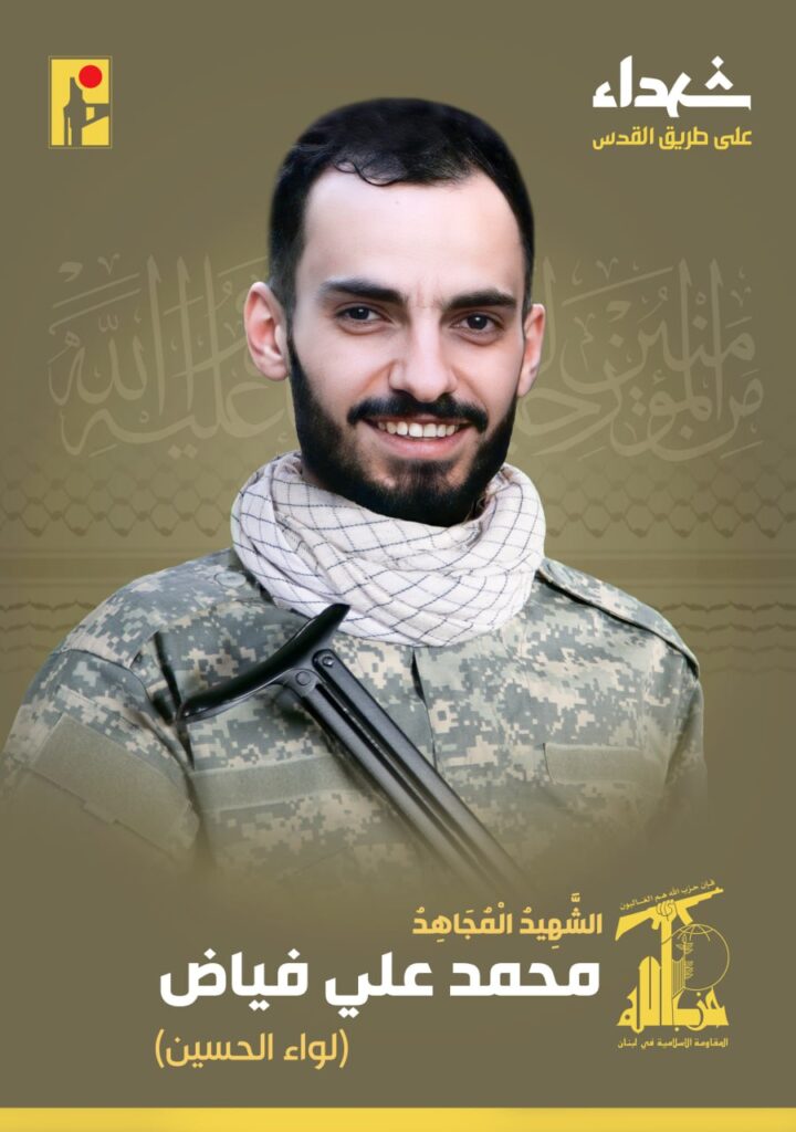 بمزيد من الفخر والإعتزاز، تزف المقاومة الإسلامية الشهيد المجاهد محمد علي فياض “لواء الحسين” مواليد عام 1997 من بلدة أنصار في جنوب لبنان، والذي ارتقى شهيداً على طريق القدس.
