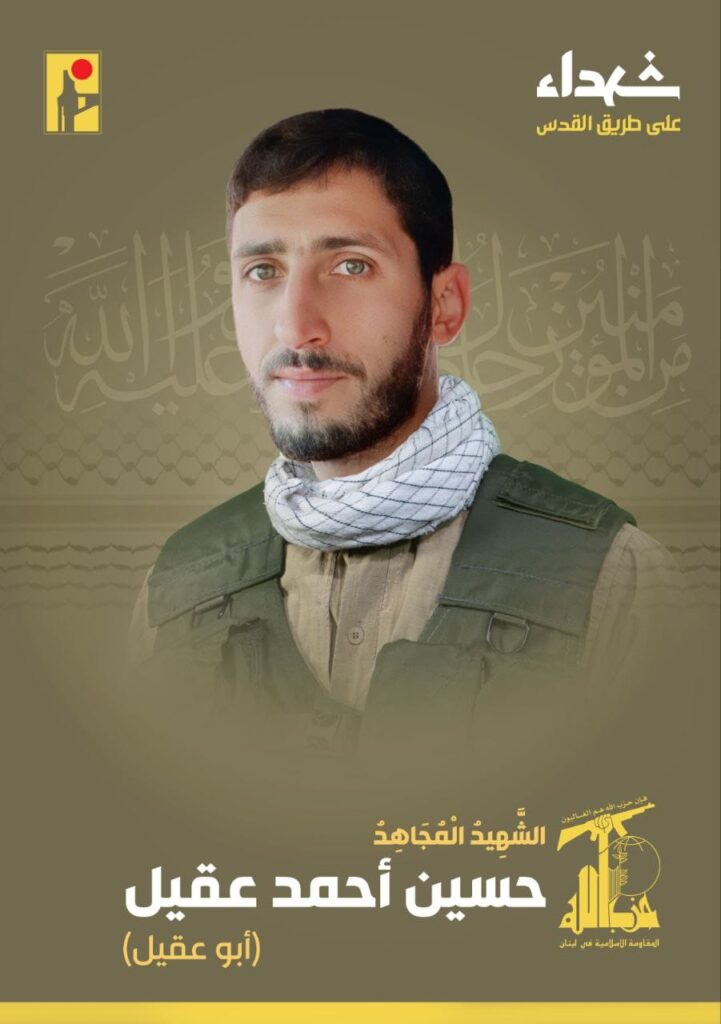 بمزيد من الفخر والإعتزاز، تزف المقاومة الإسلامية الشهيد المجاهد حسين أحمد عقيل “أبو عقيل” مواليد عام 1988 من بلدة الجبين في جنوب لبنان، والذي ارتقى شهيداً على طريق القدس.