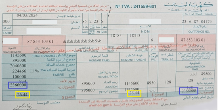 أصدرت شركة بوتك للصيانة والتشغيل BUS بياناً توجهت فيه إلى جميع المشتركين في المنطقة الجغرافية الأولى (جبل لبنان الشمالي – محافظة لبنان الشمالي – محافظة عكار). وقالت: “إنه بناءً على بيان مؤسسة كهرباء لبنان الصادر بتاريخ 6 شباط 2024، نحيطكم علماً أنّه ابتداءً من إصدار شهر أيار2023، ستحتسب قيمة فاتورة الكهرباء بالليرة اللبنانية وما يعادلها بالدولار الأميركي وبالتالي بات بإمكان المشتركين تسديد قيمة الفاتورة بإحدى العملتين حسب الرغبة، وعليه لا يمكن الدفع بالعملتين معاً أي دفع جزء من المبلغ بالدولار الأميركي وجزء بالليرة اللبنانية. وفي حال رغب المشتركون في الدفع بالدولار الأميركي، نرجو تأمين المبلغ كاملاً أو بالحد الأقرب إلى قيمة الفاتورة وذلك بهدف تسهيل عملية الجباية.