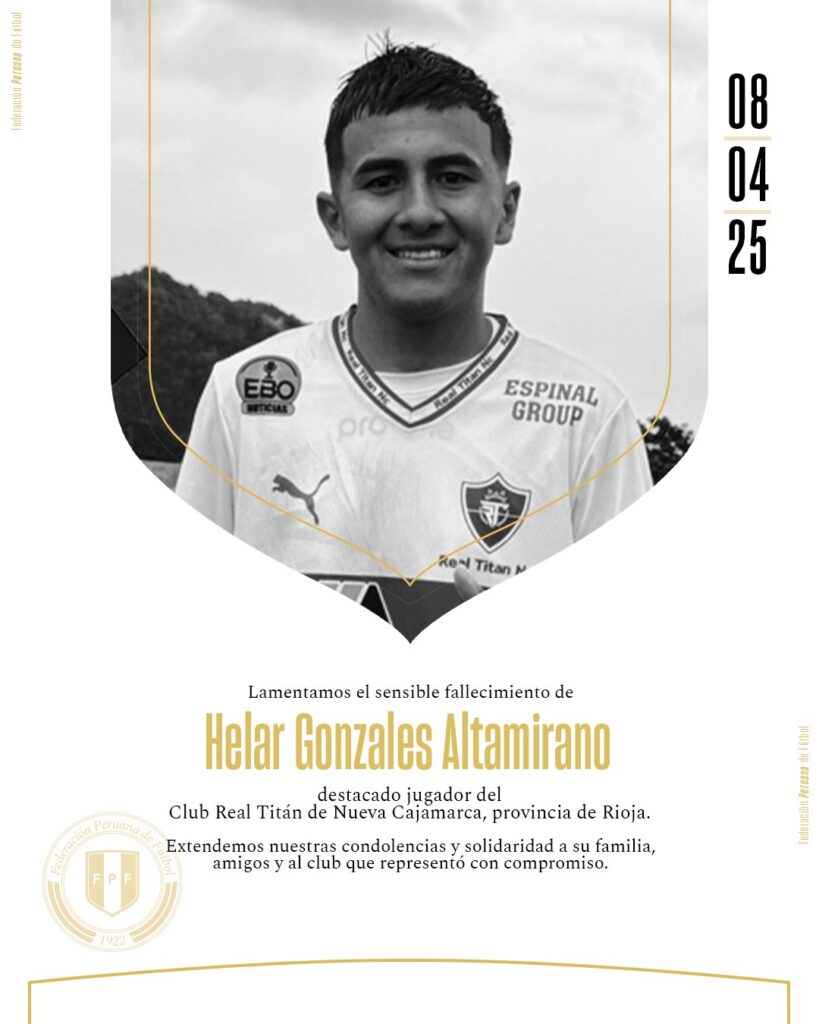 #URGENTE: Tragedia en la Copa Perú. Tras permanecer internado varios días en un hospital de Moyobamba, perdió la vida Helar Gonzales Altamirano, jugador del equipo Real Titan Nc. Esto después de chocar con el arquero de Defensor Nueva Cajamarca durante un partido por la Copa Perú pic.twitter.com/PTy3k0Nzvg