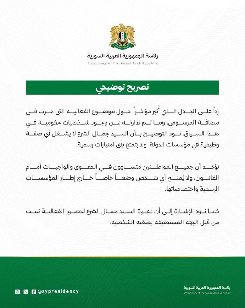 كما أوضحت الرئاسة، في بيان، أنّ دعوة جمال الشرع للفاعالية التي جرت في “مضافة المرسومي”، تمّت من قِبل الجهة المستضيفة بصفته الشخصية.